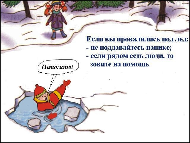 *Оказавшись на краю твёрдой поверхности, не пытайтесь сразу же подняться на ноги, лёд может снова провалиться под вами.