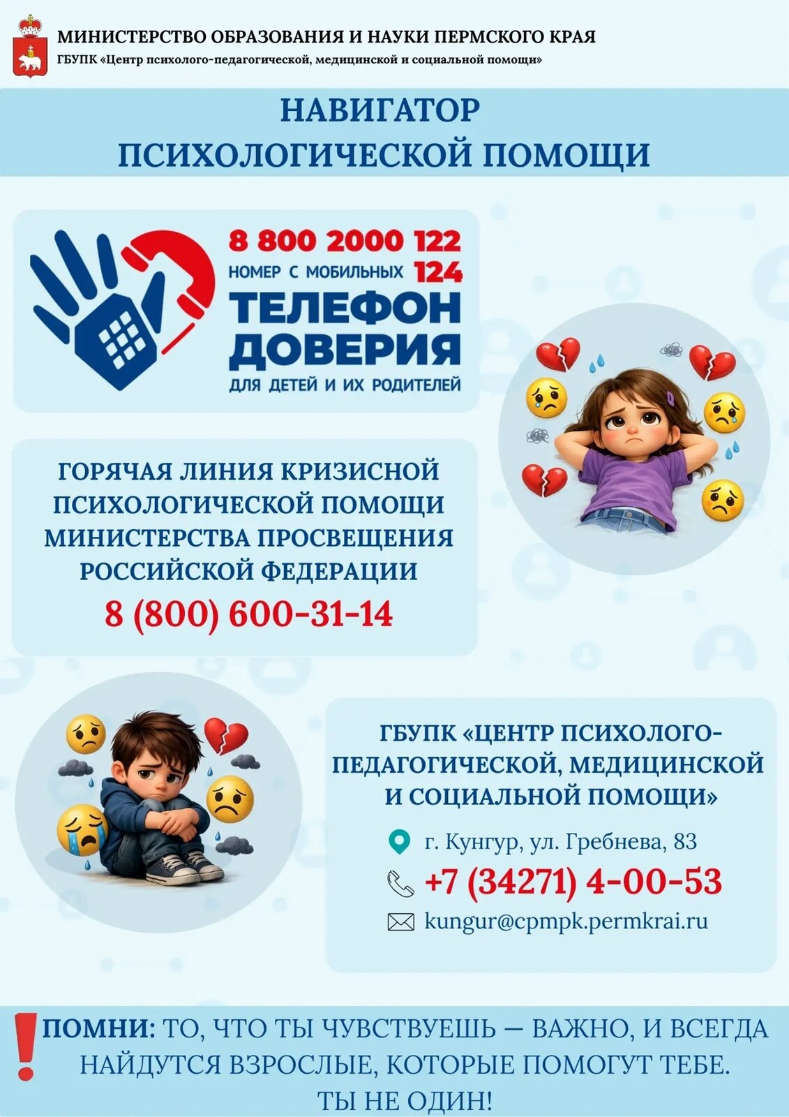Министерство образования и науки Пермского края в дополнение к письму от 19 февраля 2025 г. № 26-36-вн-264 направляет информацию об обеспечении доступности консультативно-психологической помощи для детей, подростков и их родителей по телефону доверия с единым общероссийским телефонным номером 8 800 2000 122.