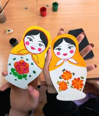 Светлана Анатольевна рассказала о матрешках, истории их появления, о различных техниках росписи и показала как можно сделать оформление с помощью двух красок. Сначала ребята потренировались, потом оформили матрешку-магнит.